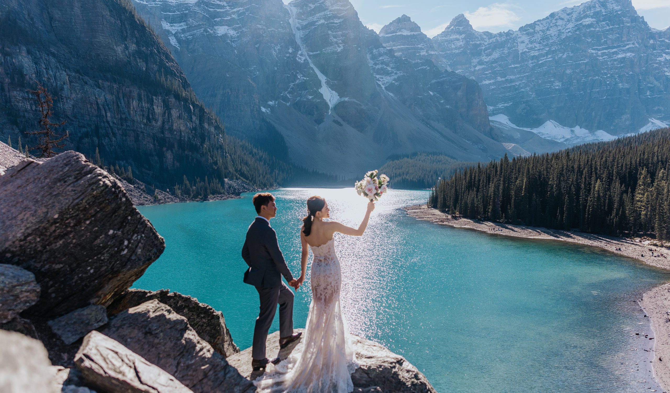 在這個令人屏息的山水之間,你的婚紗照將綻放出獨一無二的美麗,捕捉到你倆心靈深處的情感。班夫的壯麗山脈、湖泊和森林為你的婚禮增添了自然的背景,每一個瞬間都成為珍貴的回憶。我們將以專業技巧和熱情捕捉你的愛情故事,讓你在這個神奇的地方留下永久的痕跡。讓班夫見證你的愛情,讓愛在這裡綻放。"